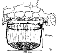 Sus dimensiones deben estar alrededor de 150 cm. de profundo por unos 50 cm. de diámetro, para facilitar el drenaje se debe depositar en el fondo un lecho de grava y otro de madera cortada en trozos pequeños, procurad depositar los líquidos no muy deprisa para que no se os "atore el hoyo". Aquí entra un poco vuestra imaginación para que no se cubra de moscas el lugar, podéis taparlo con ramos, plásticos, etc.